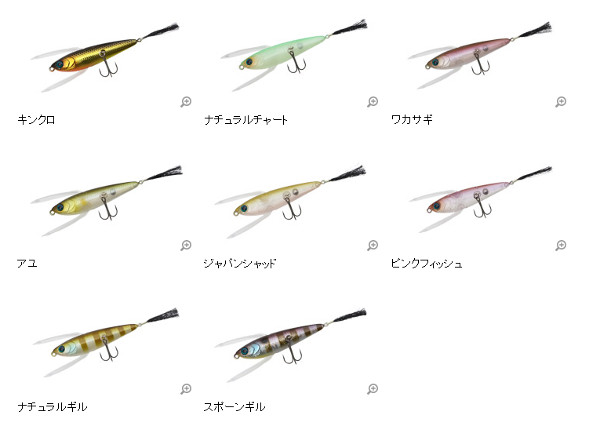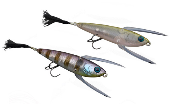 弱ったベイトフィッシュが水面でもがいているスローアクションを出すための羽ですが、羽というとらえ方ではなく、数匹のベイトが絡み合っているというイメージ!シェイクによるもがきアクションだけではなく、ただ巻きでのバタバタアクションも可能。止めてよし・揺らしてよし、巻いてよし。あらゆる誘いができる食わせのトップウォータープラグです。